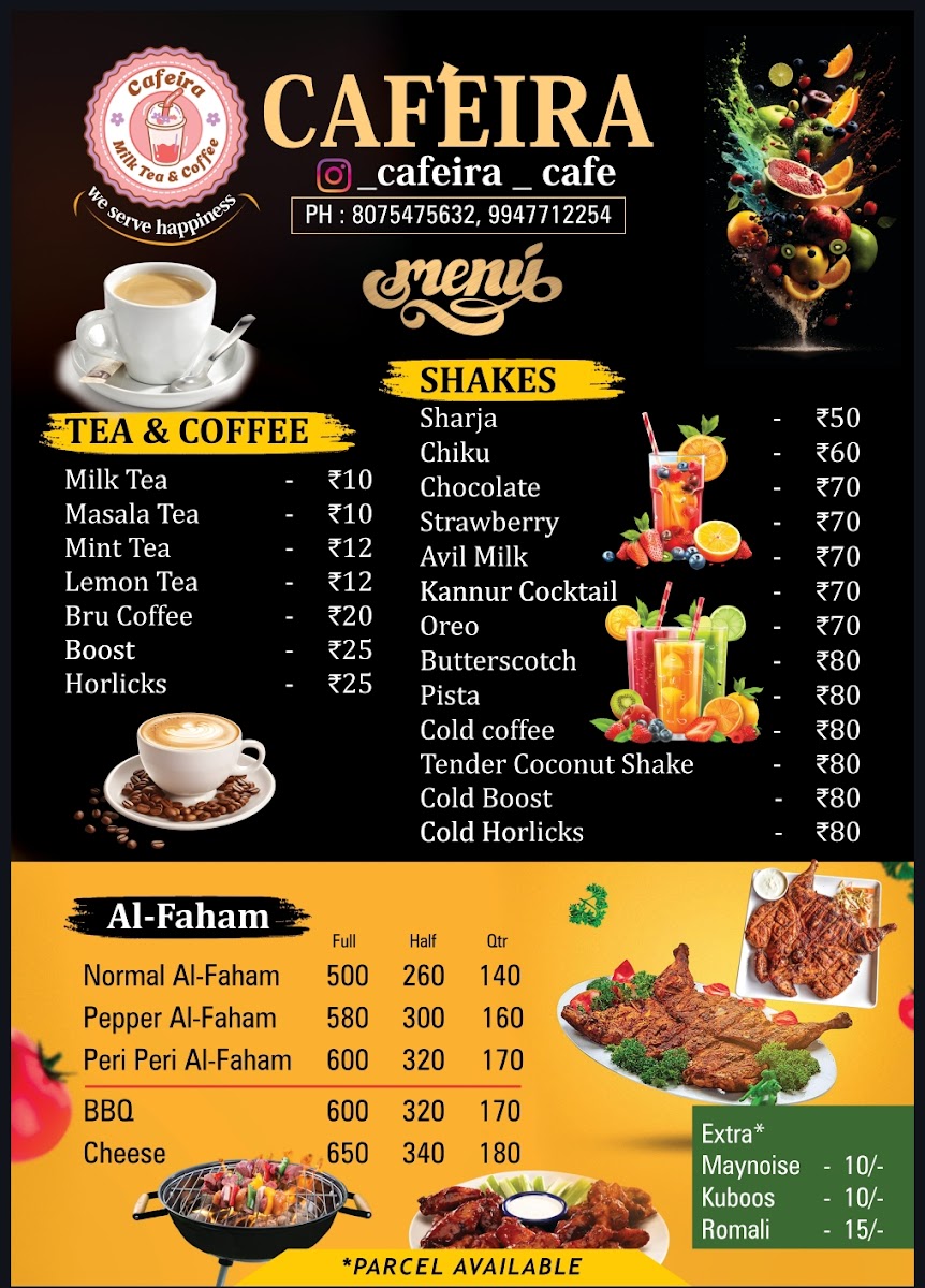 Shakes feature multiple flavors, including Sharja Shake, Chocolate, Strawberry, and Butterscotch, catering to those looking for a sweet, refreshing drink.